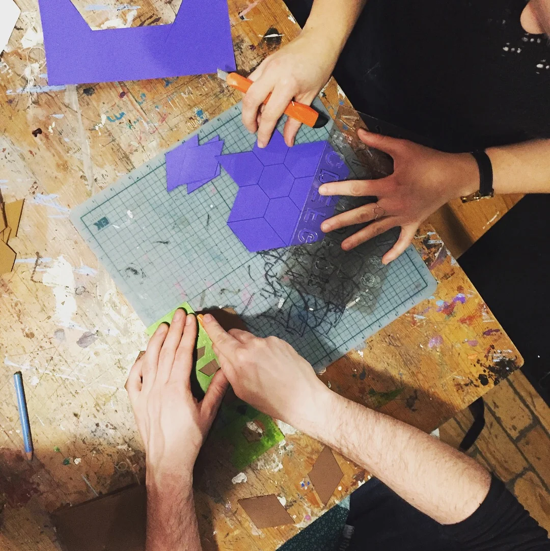 Peu de temps après, illes traçaient des formes sur du carton, repassaient les tissus et les cousaient soigneusement à la main afin de former les mosaïques de losanges et d'hexagones. Chacun-e travaillait sur son propre project, tout en consultant les autres au besoin.
